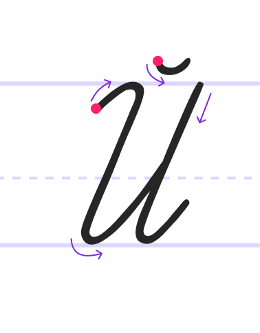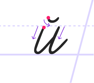 | Две отдельные части буквы: длинная наклонная линия с двумя крючками сверху и снизу; длинная наклонная линия с закруглением вправо. «Шапочка» сверху буквы: вогнутая горизонтальная дуга. | Две последовательно соединённые короткие наклонные линии с закруглением вправо. «Шапочка» сверху буквы: вогнутая горизонтальная дуга. |