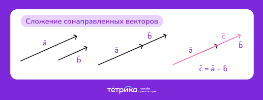 Сложение векторов производится по разным правилам. Если векторы коллинеарны и сонаправлены, тогда располагаем их таким образом, чтобы начало второго вектора совпадало с концом первого. Тогда результирующий вектор будет направлен прямо вдоль складываемых векторов. То есть его начало будет совпадать с началом первого, а конец — с концом второго.