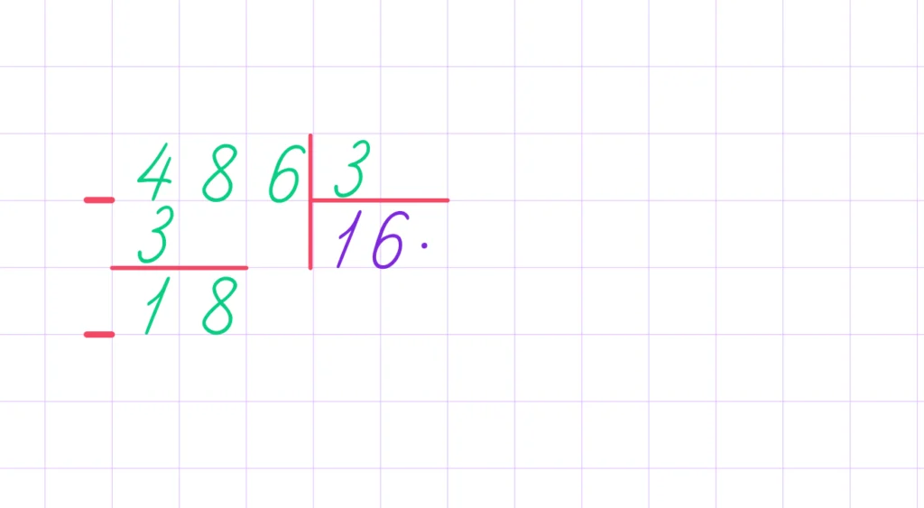 5. Остаток 1 меньше делителя 3, значит, продолжаем вычисления. Рядом с цифрой остатка 1 пишем следующую цифру делимого — 8. Следующее неполное делимое — 18.
