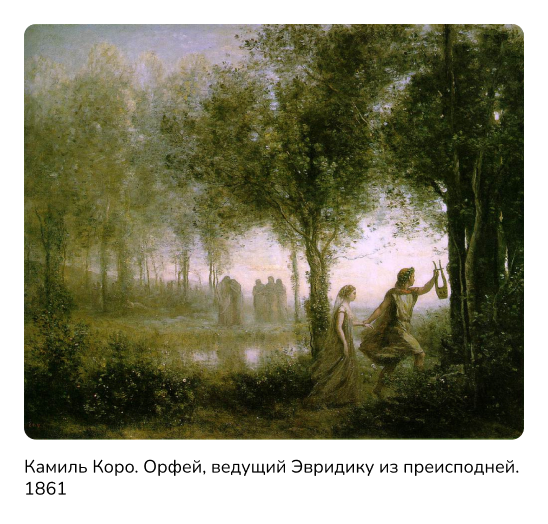 Великий певец Орфей так любил свою жену Эвридику, что когда она умерла от укуса змеи, он спустился за ней в Аид. Своей музыкой и пением он растрогал даже безжалостного Аида. Тот разрешил вывести Эвридику, но с условием: Орфей не должен оглядываться на неё, пока они не выйдут на свет. У самого выхода он не выдержал сомнений, оглянулся — и потерял жену навсегда.