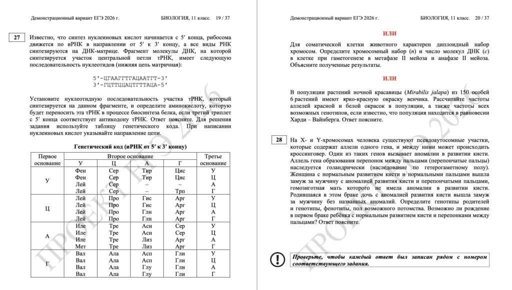 25 и 26 задания — развёрнутые ответы по темам: «Система и многообразие органического мира», «Организм человека и его здоровье», «Эволюция живой природы». Чтобы успешно их выполнить, прочитайте задания внимательно, разделите вопросы на части и запишите подробные ответы. Избегайте неточностей и биологических ошибок в формулировках. Например, половые клетки образуются, а не делятся мейозом, а рыбы — надкласс, а не класс.