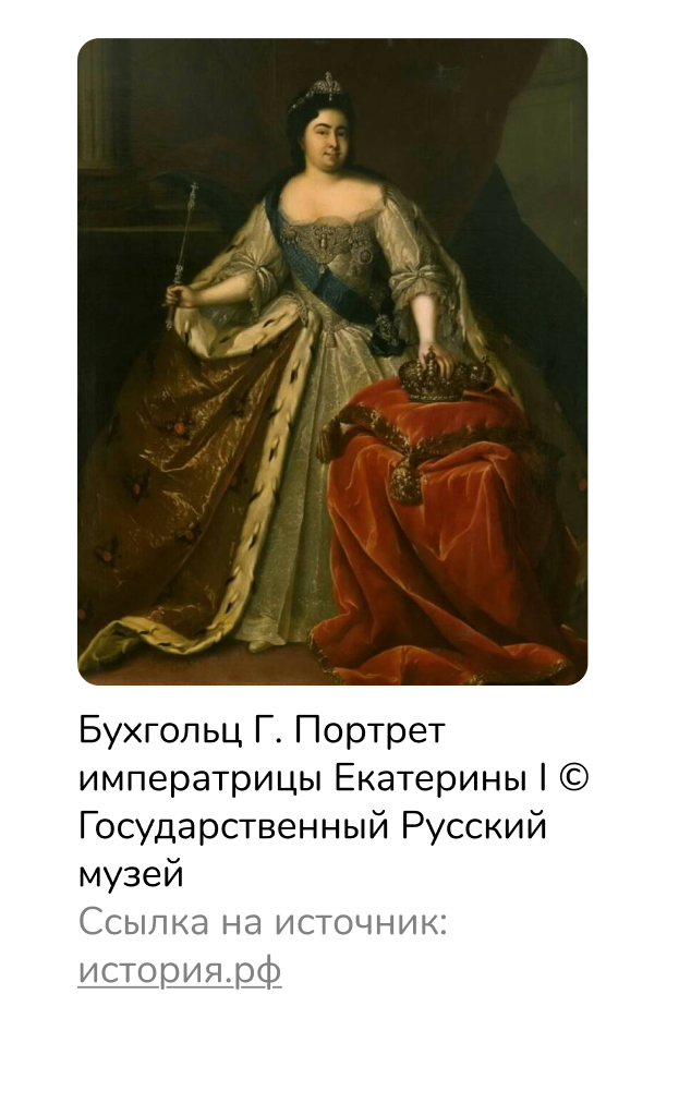 Таким образом, правление Екатерины I характеризуется переходным периодом, когда власть фактически принадлежала аристократическим элитам, а императрица служила символом продолжения наследия Петра Великого.