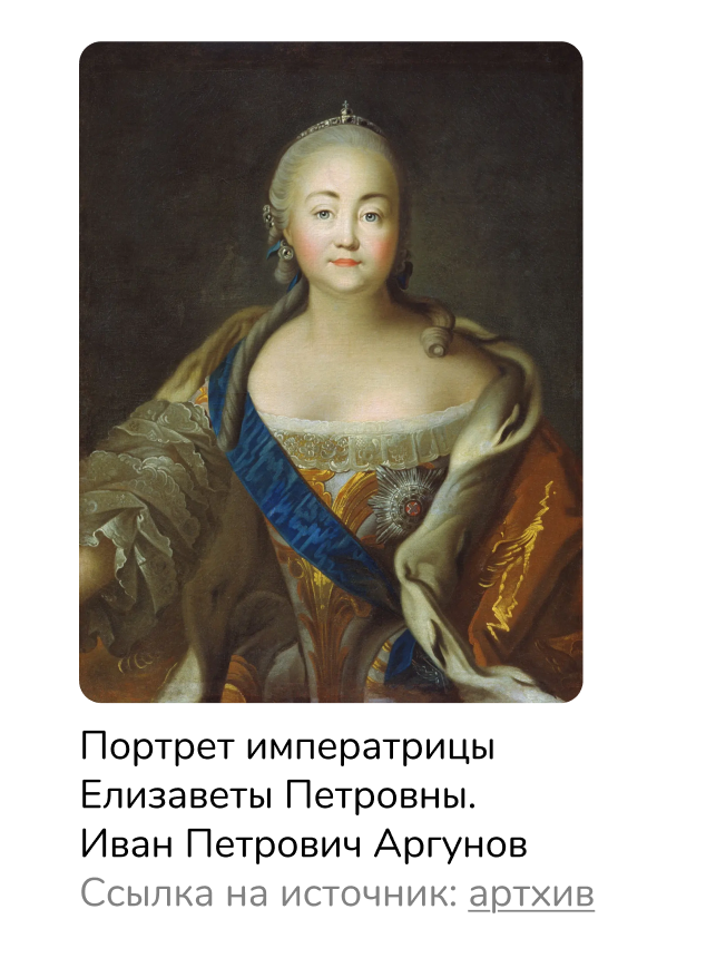 - 1741–1761 гг. — правление Елизаветы Петровны.