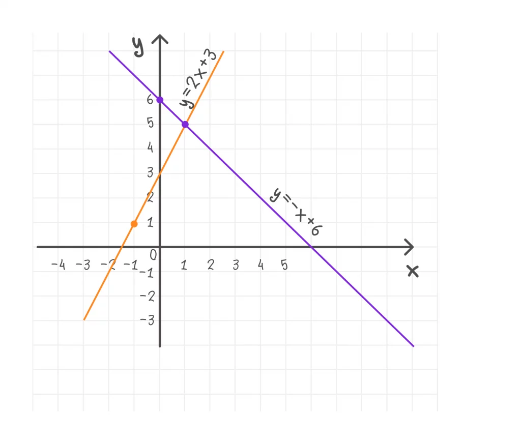 Найдите точку пересечения графиков функций y = 2x + 3 и y = −x + 6. Постройте графики.