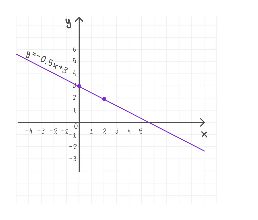 Это линейная функция, её график — прямая линия. Уравнение имеет вид y = kx + b, где k = −0,5 — угловой коэффициент (показывает угол наклона прямой), b = 3 — точка пересечения с осью ОУ.