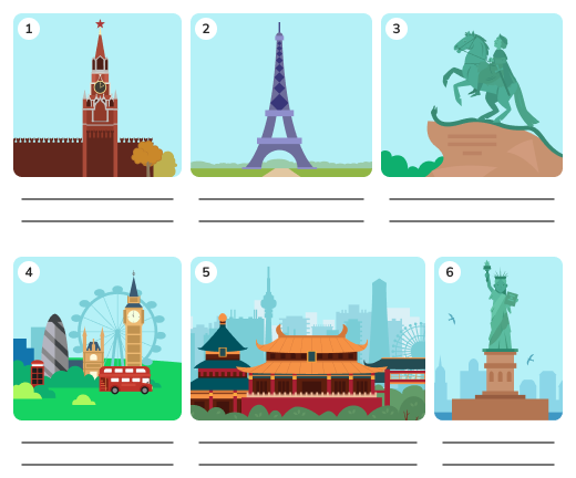 📎 Задание 3. Рассмотрите картинки известных достопримечательностей. А также определите, в каком городе и стране они находятся.