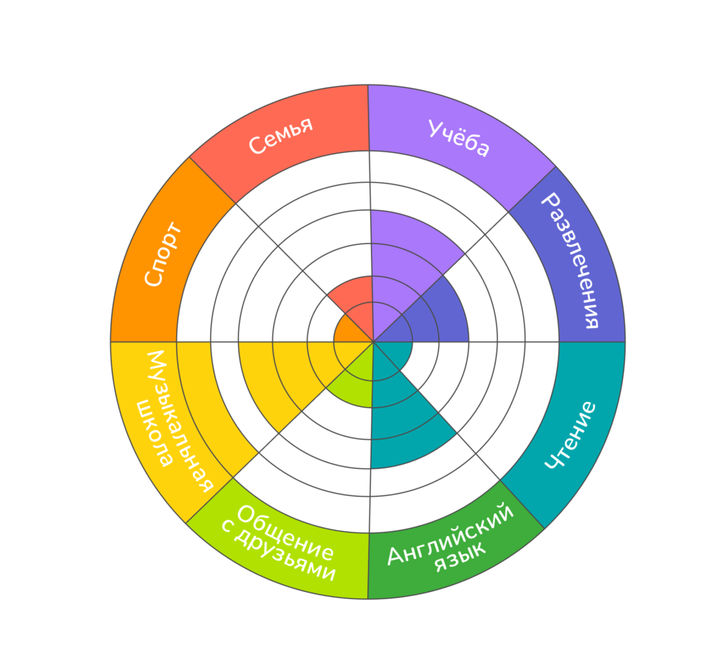 1️⃣ Составьте колесо баланса. Нарисуйте круг, разделите его на восемь секторов: учёба, семья, здоровье, отдых, спорт, друзья, творчество, личное время. Пусть ребёнок сам оценит, сколько времени уходит на каждую сферу сейчас. Обсудите, где перегиб, а чему не хватает внимания. Такой наглядный анализ покажет — что нужно поменять, чтобы жизнь школьника стала по-настоящему сбалансированной.
