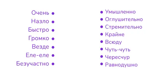 | Образа действия | Как? Каким образом? | Быстро, медленно, громко, весело, вдруг, шёпотом, верхом, пешком, вплавь |