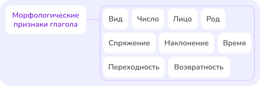У глаголов есть постоянные (вид, возвратность, переходность, спряжение) и непостоянные (наклонение, род, число, время, лицо) морфологические признаки. Некоторые из них изучают в начальной школе, другие — только в средней.