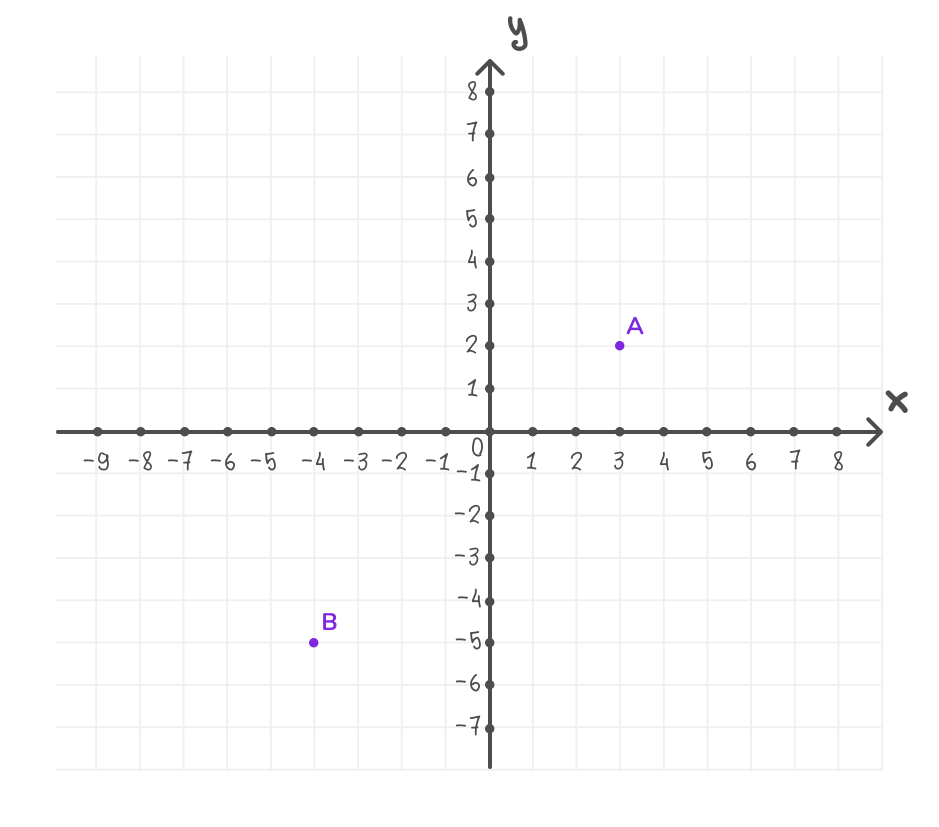 - Ордината (y) — это расстояние от точки до оси абсцисс (горизонтальной оси).