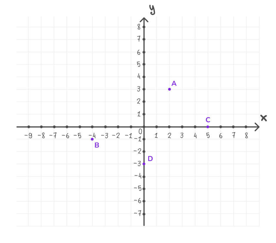 4. Точка D лежит на оси y на расстоянии 3 единицы вниз от начала координат.