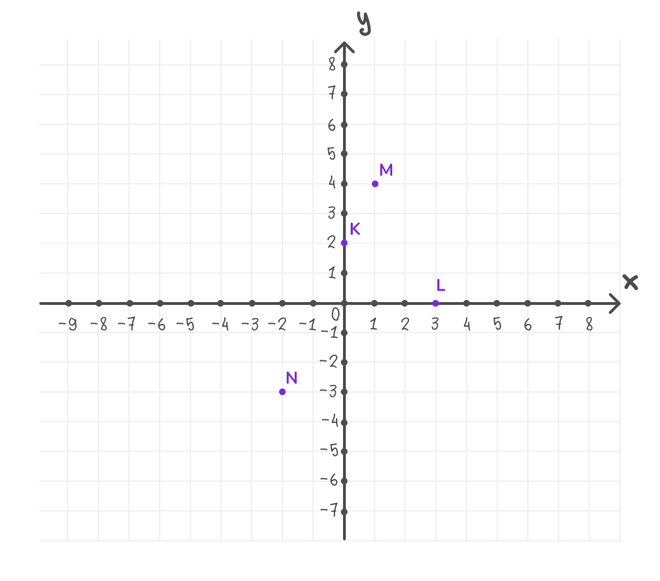 Постройте точки M(1;4), N(−2;−3), K(0;2) и L(3;0) на координатной плоскости.