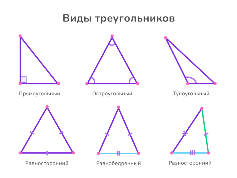 В зависимости от соотношения длин сторон треугольники подразделяются на равносторонние, равнобедренные (две из трёх сторон равны по длине) и разносторонние. А также существует классификация треугольников по углам: остроугольные (все углы менее 90°), прямоугольные (один из углов 90°), тупоугольные (один из углов более 90°).