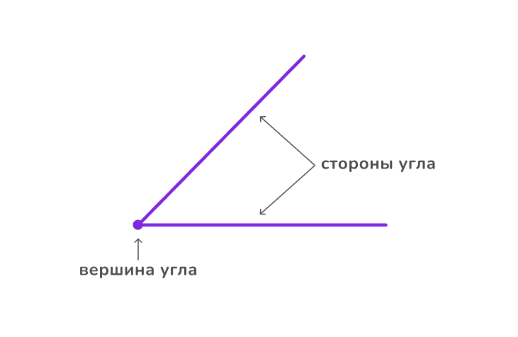 Когда из одной точки исходят два луча, то они образуют угол. При этом точку называют вершиной угла, а лучи — его сторонами.