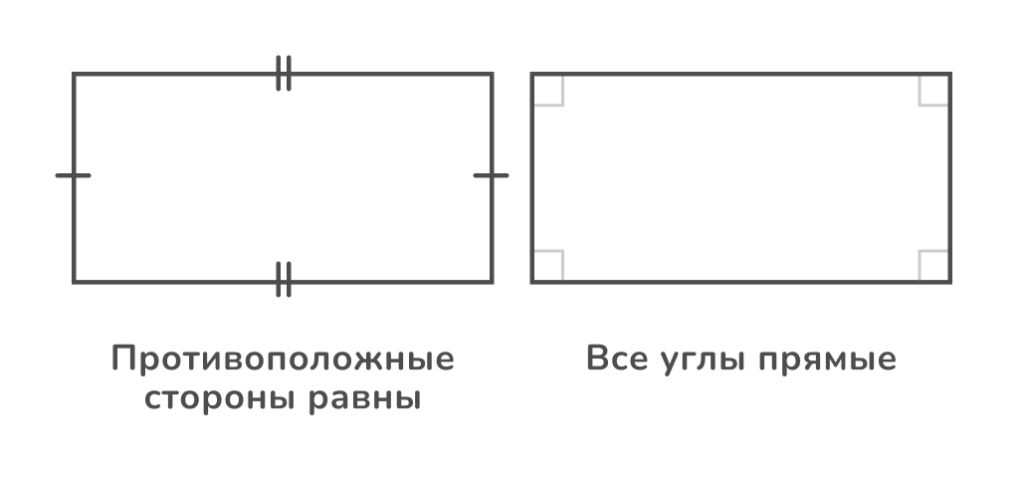 Четырёхугольник, у которого все четыре угла прямые, — прямоугольник. У прямоугольника противоположные стороны равны и параллельны.
