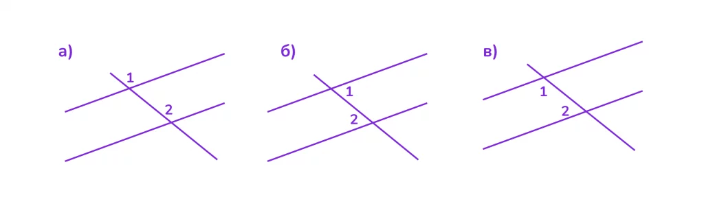 - на рисунке a∥b, с — секущая; ∠1 и ∠5, ∠2 и ∠6, ∠3 и ∠7, ∠4 и ∠8 — соответственные; ∠3 и ∠5, ∠4 и ∠6 — накрест лежащие; ∠4 и ∠5, ∠3 и ∠6 — односторонние.