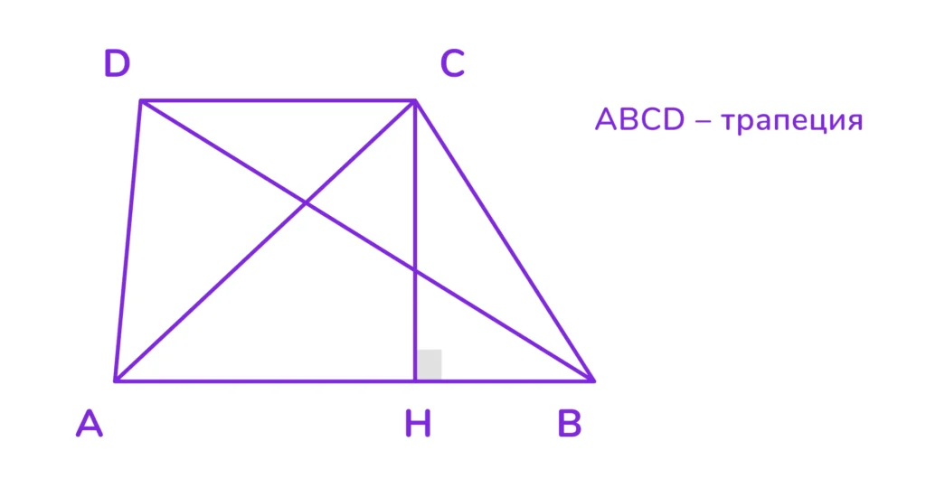 - Высота трапеции — перпендикуляр, проведённый из любой точки одного основания к другому основанию (на рисунке 1: CH).