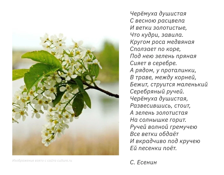 Помимо берёзы, его любимицы, Есенин часто обращался к образу других растений. Например, черёмуха у автора — это символ весны, молодости, буйства сил и любви. Она часто предстаёт в образе невесты или девушки.