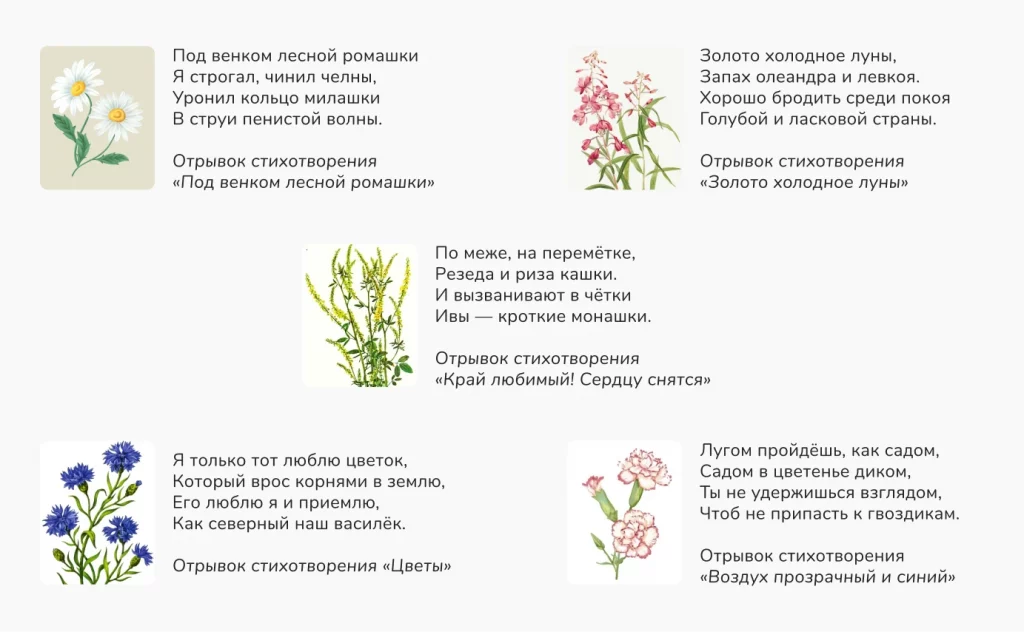 📝 Задание 3. Прочитайте отрывки из стихотворений Сергея Есенина и определите, о каком растении или дереве идёт речь. Соедините название растения с соответствующим ему отрывком.