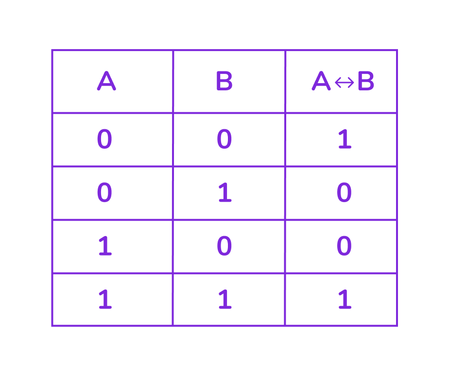 Эквивалентность истинна (1), только когда A и B равны (оба 0 или оба 1). И эквивалентность ложна (0), когда A и B разные (0 и 1, или 1 и 0).