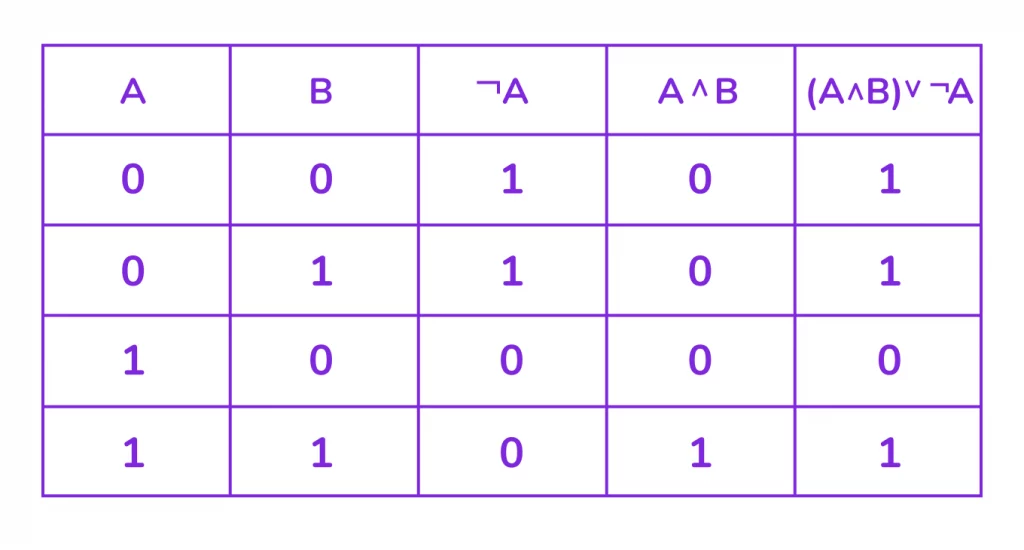 - Или «Если не идёт дождь (A=0), то я беру зонт (B=1)» → истинно (1) — я могу взять зонт для защиты от солнца.