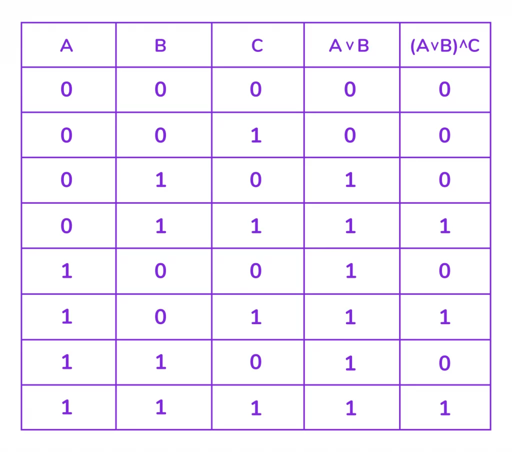 Пример 2. Построить таблицу истинности для выражения: (A ∨ B) ∧ C.