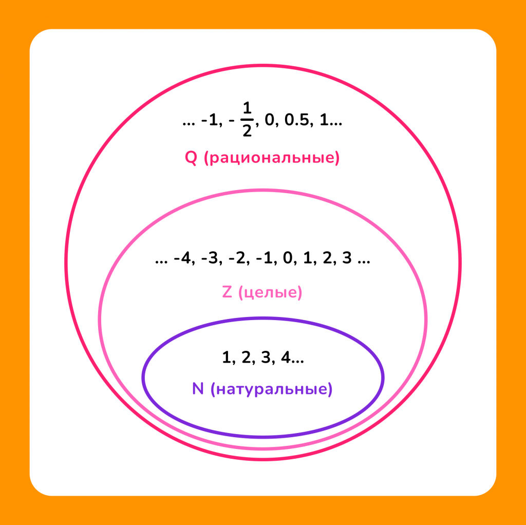 Целые числа являются частью более широкого множества чисел. Рассмотрим основные множества чисел и их подмножества: