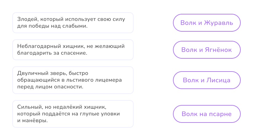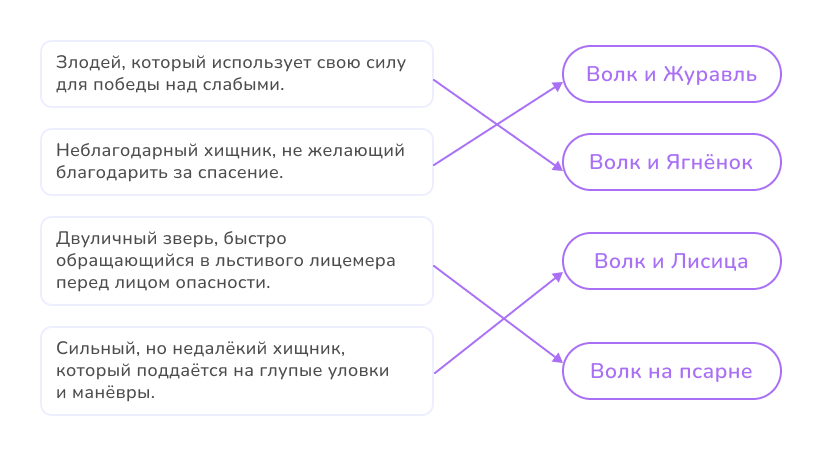 📌 Задание 3. Соотнесите характеристику образа Волка с названием басни И. А. Крылова, в котором он использован.